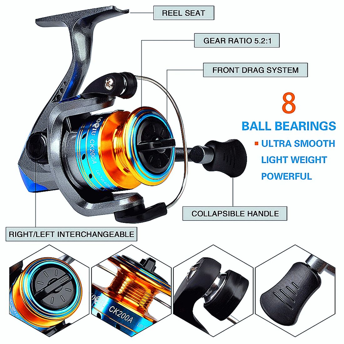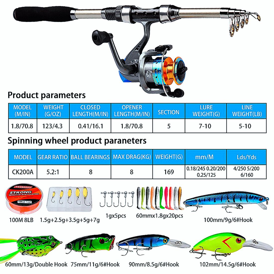 1.8M Children use:1pc 1.8m Rod+1pc CK200A Spinning Reel+1pc 100m&8LB Nylon Line+1box Spoonbaits+5pc 1g Jigging Hooks+20pcs 60mm-1.8g Soft Baits+ 1pc 100mm-9g Minnow+1pc 102mm-14.5g Minnow+1pc 90mm-8.5g Minnow+1pc 75mm-11g Popper+1pc 60mm-13g Frog+1pc Bag