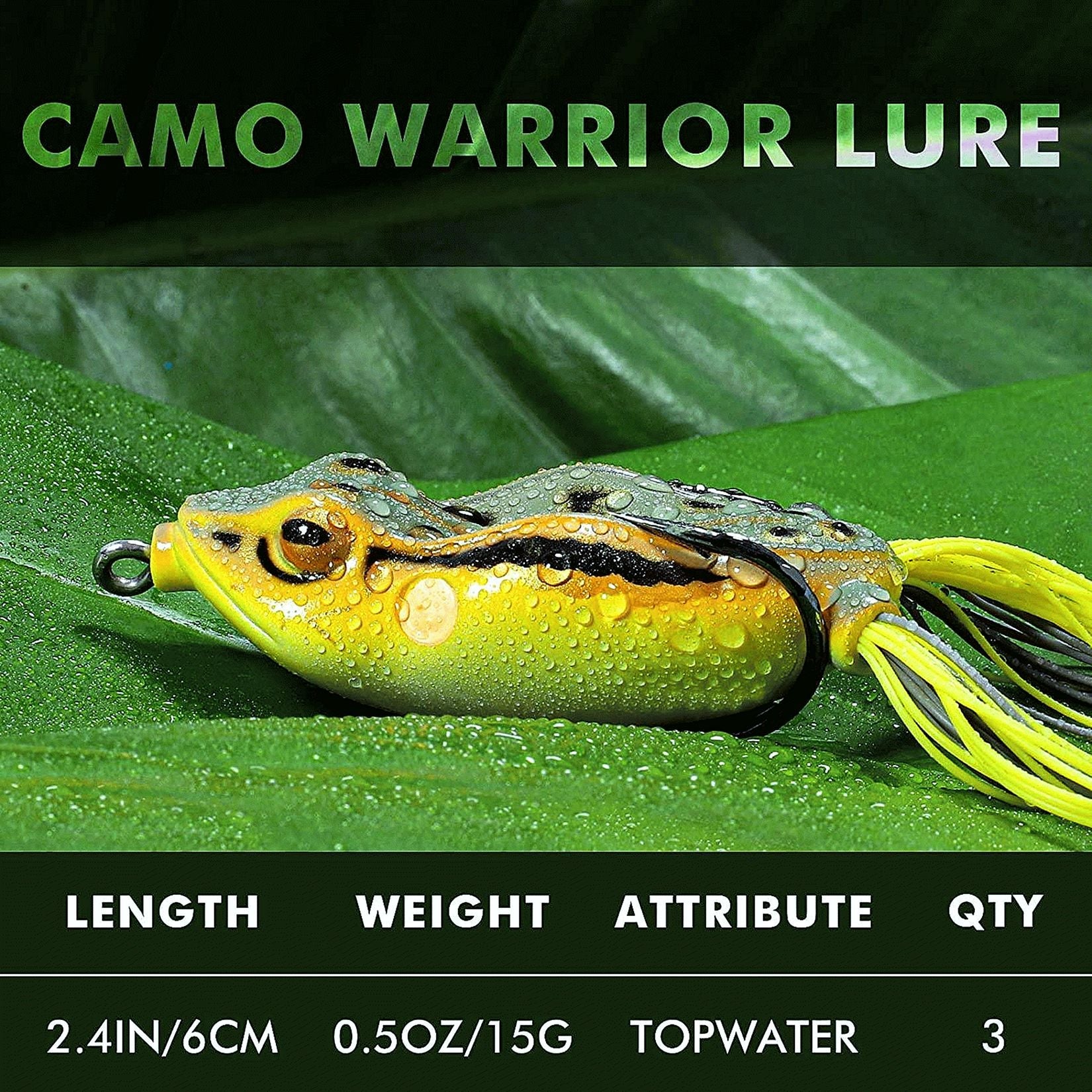 - 【Perfectly 45°Entry Angle】FISHINGHUB Camo Warrior frogs lures unorthodox body profile, cupped sides, flat belly, and advanced balancing system were strategically calculated to facilitate a killer walk-the-dog action and produce an incredible amount of turbulence. The frog bait is equipped with an internal hidden weight system and elongated body shape that makes it have a perfect 45°angle on the surface and allows anglers to create an effortless walk-the-dog action thanks to its streamlined design.