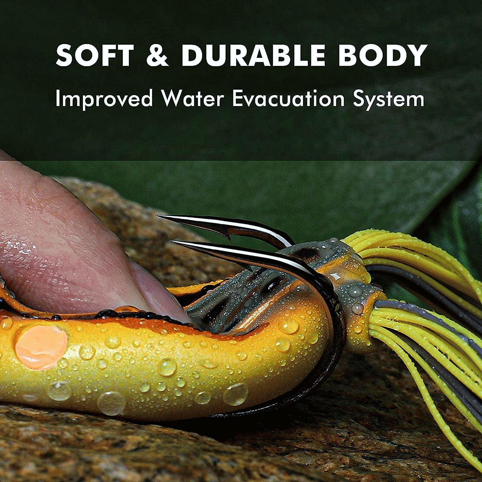 - 【Fine-cut Blade Tail Skirting】 The frogs fishing lures feature a fine-cut single silicone tail that helps deliver additional subtle attraction and aid in the walking action as well. As an additional highlight, when the tail gets wet the extra weight from the water makes it more wind-resistant and allows for long-distance casts. Complete with perfectly trimmed rubber skirting, the frog Hollow Body Frog is sure to draw big blow ups.